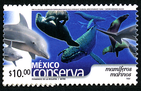 No. Scott: 2266 -- Año de Emisión: 2002 -- Valor Facial: $ 10.00 -- Multicolor -- Perforación: 14 -- Tipo de Impresión: Offset Timbre Postal multicolor perteneciente a la colección de México Conserva, en la imagen se observa un paisaje acuático en el cual aparece un gran número de mamíferos marinos, los cuales poseen poco pelo, por lo general muy pocas cerdas retenidas alrededor de la cabeza o boca, sobre la estampilla está escrito el valor facial de "$10.00", "MÉXICO mamíferos marinos" y "FERNÁNDEZ DE LA REGUERA / MITRE / TIEV". Para más información favor de dirigirse a biblioteca@mufi.org.mx