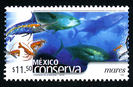 No. Scott: 2270 -- Año de Emisión: 2002 -- Valor Facial: $ 11.50 -- Multicolor -- Perforación: 14 -- Tipo de Impresión: Offset Timbre Postal multicolor perteneciente a la colección de México Conserva, en la imagen se observa una porción de agua con un gran número de animales acuáticos que viven en ella como la ballena, tiburón caballito de mar, calamar, cangrejo etc, sobre la estampilla está escrito el valor facial de "$11.50", "MÉXICO mares" y "FERNÁNDEZ DE LA REGUERA / MITRE / TIEV". Para más información favor de dirigirse a biblioteca@mufi.org.mx