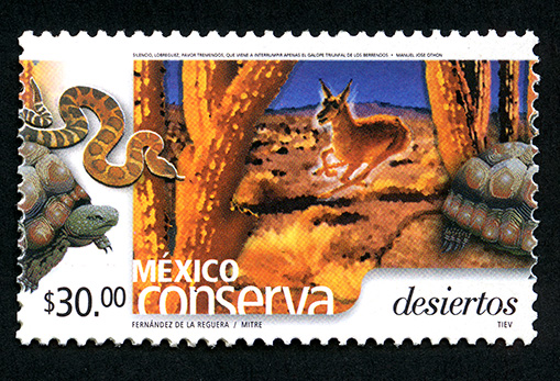 No. Scott: 2273 -- Año de Emisión: 2002 -- Valor Facial: $ 30.00 -- Multicolor -- Perforación: 14 -- Tipo de Impresión: Offset Timbre Postal multicolor perteneciente a la colección de México Conserva, en la imagen aparece un paisaje con terreno arenoso y carente de vegetación, solo se observan algunos cactus y algunos animales como la tortuga, serpiente y zorro, sobre la estampilla está escrito el valor facial de "$30.00", "MÉXICO desiertos" y "FERNÁNDEZ DE LA REGUERA / MITRE / TIEV". Para más información favor de dirigirse a biblioteca@mufi.org.mx