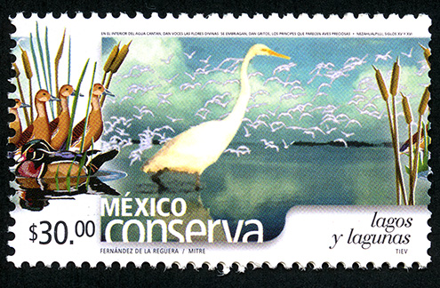 No. Scott: 2274 -- Año de Emisión: 2002 -- Valor Facial: $ 30.00 -- Multicolor -- Perforación: 14 -- Tipo de Impresión: Offset Timbre Postal multicolor perteneciente a la colección de México Conserva, al fondo de la imagen aparece una laguna de agua, sobre el cielo un gran número de aves volando, en primer plano y sobre una superficie plana se observa un ave de cuerpo color blanco, patas cortas y pico amarillo, también hay un poco de flora acuática, sobre la estampilla está escrito el valor facial de "$30.00", "MÉXICO lagos y lagunas" y "FERNÁNDEZ DE LA REGUERA / MITRE / TIEV". Para más información favor de dirigirse a biblioteca@mufi.org.mx