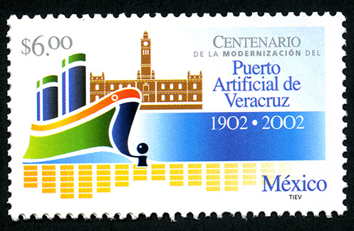 No. Scott: 2276 -- Año de Emisión: 2002 -- Valor Facial: $ 6.00 -- Multicolor -- Perforación: 14 -- Tipo de Impresión: Offset Timbre Postal Mexicano multicolor, en él aparece una ilustración surrealista, mostrando un barco y el edificio El Faro Venustiano Carranza, en el estado de Veracruz, sobre la estampilla está escrito el valor facial de "$6.00", "CENTENARIO DE LA MODERNIZACIÓN DEL Puerto Artificial de Veracruz, 1902-2002", "MÉXICO" y "TIEV". Para más información favor de dirigirse a biblioteca@mufi.org.mx