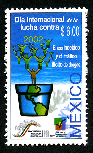 No. Scott: 2285 -- Año de Emisión: 2002 -- Valor Facial: $ 6.00 -- Multicolor -- Perforación: 14 -- Tipo de Impresión: OffsetTimbre Postal Mexicano multicolor, sobre un fondo azul y blanco, se observa un recipiente contenedor en forma de cono, encima tiene impreso el mapa del continente americano, enmedio y de él aparece una figura humana con los brazos extendidos hacia arriba, de esos brazos salen un gran número de siluetas también con los brazos abiertos, sobre la estampilla está escrito "Día Internacional de la lucha contra El uso indebido y el tráfico ilícito de drogas", "MÉXICO", "TIEV" y en la parte inferior aparecen los emblemas de LA PROCURADURÍA GENERAL DE LA REPÚBLICA y "¡va por tí! la prevención es primero.