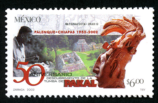 No. Scott: 2283 -- Año de Emisión: 2002 -- Valor Facial: $ 6.00 -- Multicolor -- Perforación: 14 -- Tipo de Impresión: OffsetTimbre Postal Mexicano multicolor, al fondo de la imagen, aparece una área arqueológica rodeada de mucha vegetación, en segundo plano del lado derecho, se observa a un hombre sentado, de perfil, sosteniendo un objeto con una mano, como si estuviera realizando alguna actividad, en primer plano se aprecia una cabeza maya, ami parecer está hecha de madera, sobre la estampilla está escrito "MÉXICO", "CONACULTA-INAH", "PALENQUE -CHIAPAS 1952-2002", "50 ANIVERSARIO DE LA TUMBA DE PAKAL, el valor facial de "$6.00" y "ZAGARRA 2002".
