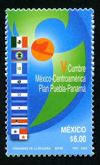 No. Scott: 2286 -- Año de Emisión: 2002 -- Valor Facial: $ 6.00 -- Multicolor -- Perforación: 14 -- Tipo de Impresión: OffsetTimbre Postal Mexicano multicolor, al fondo de la aimagen aparece un medio círculo y sobre él, está en Continente Americano, señalando dentro de un círculo color amarillo la zona de Centroamérica, en primer plano se observan las banderas de México, Belice, Costa Rica, El Salvador, Guatemala, Honduras, Nicaragua y Panamá, sobre la estampilla está escrito "V Cumbre México-Centroamérica Plan Puebla-Panamá", "MÉXICO", el valor facial de "$6.00" y "FERNÁNDEZ DE LA REGUERA, MITRE, TIEV, 2002".