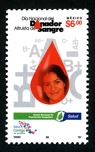 Timbre Postal Mexicano multicolor, al fondo de la imagen se observan letras y signos AB+, AB-, B+, B-, O+, O-, A+ y A- , en primer plano y al centro aparece la cara de una mujer dentro de una gota de color rojo, en la parte superior está escrito "Día Nacional del donador Altruista de Sangre", "MÉXICO", el valor facial de "$6.00", en la parte inferior se aprecia el logotipo del Centro Nacional de transmisión Sanguínea, Salud", "Salud Contigo es positivo" y TENORIO / 2002 / TIEV.