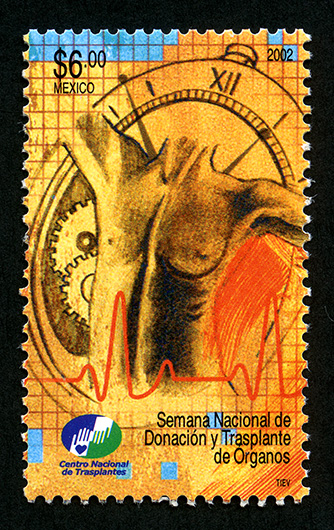 No. Scott: 2294 -- Año de Emisión: 2002 -- Valor Facial: $ 6.00 -- Multicolor -- Perforación: 14 -- Tipo de Impresión: Offset Timbre Postal Mexicano multicolor, sobre un fondo cuadraculado, se observa un instrumento para indicar la hora, no se aprecia si es fijo o portátil, sobre de éste aparece un torso humano y una línea de la frecuencia cardiaca, en la parte superior está escrito el valor facial de "$6.00", "MÉXICO", "2002", en la parte inferior el logotipo del "Centro Nacional de Transplantes, "Semana Nacional de Donación y Transplantede Órganos" y "TIEV". Para más información favor de dirigirse a biblioteca@mufi.org.mx