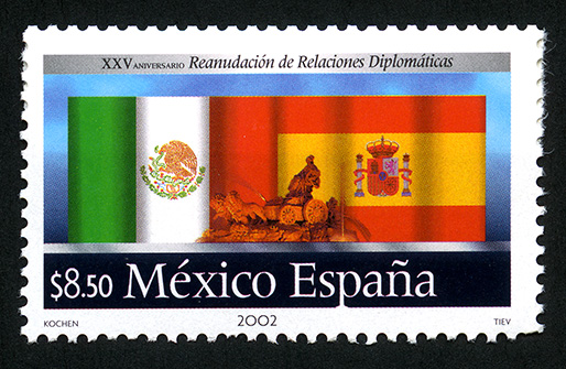 No. Scott: 2298 -- Año de Emisión: 2002 -- Valor Facial: $ 8.50 -- Multicolor -- Perforación: 14 -- Tipo de Impresión: Offset Timbre Postal Mexicano multicolor, en la imagen se observan juntas las banderas de México y España, frente a ellas aparece una pieza artística. En la parte superior está escrtio "XXV ANIVERSARIO Reanudación de Relaciones Diplomáticas", en la parte inferior el valor facial de "$8.50", "México España", "KOCHEN. 2002, TIEV". Para más información favor de dirigirse a biblioteca@mufi.org.mx