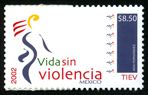 No. Scott: 2301 -- Año de Emisión: 2002 -- Valor Facial: $ 8.50 -- Multicolor -- Perforación: 14 -- Tipo de Impresión: Offset Timbre Postal Mexicano multicolor, sobre un fondo color blanco y en una ilustración surrealista, se observan varias líneas curvas en diferentes colores, mismas que dan forma a la silueta de una mujer, del lado derecho y dentro de un rectángulo en color azul, está escrito el vaslor facial de "$8.50" y "ANA FERNÁNDEZ", en la parte inferior se leé "2002", "Vida sin violencia", "MÉXICO" y "TIEV". Para más información favor de dirigirse a biblioteca@mufi.org.mx