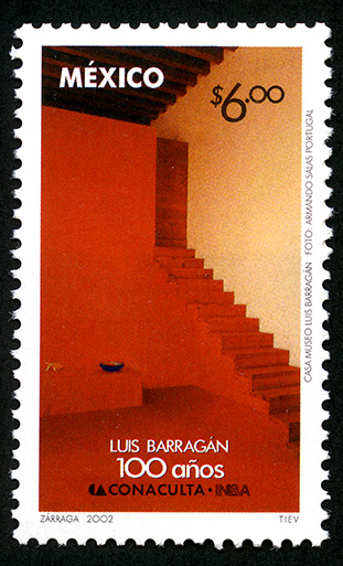 No. Scott: 2297 -- Año de Emisión: 2002 -- Valor Facial: $ 6.00 -- Multicolor -- Perforación: 14 -- Tipo de Impresión: Offset Timbre Postal Mexicano multicolor, en la imagen se observa una fotografía del arquitecto Luis Barragan titulada "Escalera", este espacio corresponde a una sola habitación dividida por algunos muros, mostrando las escaleras del lado derecho, en la parte de arriba se deja ver un tapanco de madera, sobre la estamplilla está escrito "MÉXICO", el valor facial de "$6.00", en la parte inferior "LUIS BARRAGÁN 100 años", "CONACULTA °INBA", "ZARRABA 2002, TIEV" y "CASA MUSEO LUIS BARRAGAN, FOTO ARMANDO SALAS PORTUGAL". Para más información favor de dirigirse a biblioteca@mufi.org.mx