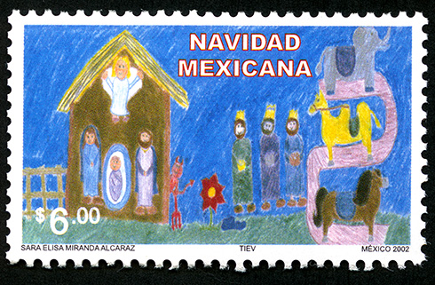 No. Scott: 2304 -- Año de Emisión: 2002 -- Valor Facial: $ 6.00 -- Multicolor -- Perforación: 14 -- Tipo de Impresión: Offset Timbre Postal Mexicano multicolor, en la imagen aparece una ilustración infantil y surrealista, en la cual aparece un pesebre con José, María, el niño Dios y un Ángel, afuera está el Diablo y los tres Reyes Magos, así como un elefante, un camello y un caballo, sobre la estampilla esté escrito "NAVIDAD MEXICANA", el valor facial de "$6.00" y "SARA ELISA MIRANDA ALCARAZ, TIEV, MÉXICO 2002". Para más información favor de dirigirse a biblioteca@mufi.org.mx