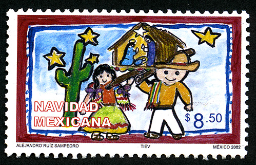 No. Scott: 2305 -- Año de Emisión: 2002 -- Valor Facial: $ 8.50 -- Multicolor -- Perforación: 14 -- Tipo de Impresión: Offset Timbre Postal Mexicano multicolor, en la imagen aparece una ilustración infantil y surrealista, en la cual aparecen una niña y un niño vestidos de peregrinos y cargando sobre sus hombros una pequeña caja de madera en la que se observan tres figuras humanas, al lado de ellos hay un cactus y algunas estrellas en el cielo, sobre la estampilla está escrito "NAVIDAD MEXICANA", el valor facial de "$8.50" y "ALEJANDRO RUIZ SAMPEDRO, TIEV. MÉXICO 2002". Para más información favor de dirigirse a biblioteca@mufi.org.mx