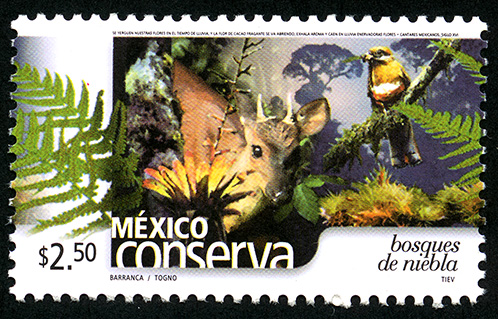 No. Scott: 2324 -- Año de Emisión: 2003 -- Valor Facial: $ 2.50 -- Multicolor -- Perforación: 13 x 13 1/4 y 14 -- Tipo de Impresión: Offset Timbre Postal multicolor perteneciente a la colección de México Conserva, en la imagen aparece un bosque nublado, con selva húmeda y montañoso, tambión aparecen se observa a un ave y a un animal mamífero, sobre la estampilla está escrito el valor facial de "$2.50", "MÉXICO bosques de niebla" y "FERNÁNDEZ DE LA REGUERA / MITRE / TIEV". Para más información favor de dirigirse a biblioteca@mufi.org.mx