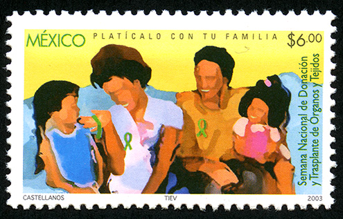 No. Scott: 2333 -- Año de Emisión: 2003 -- Valor Facial: $ 6.00 -- Multicolor -- Perforación: 13 -- Tipo de Impresión: OffsetTimbre Postal Mexicano multicolor, en la imagen aparece una familia de cuatro integrantes, papá, mamá, hija e hijo, ellos se encuentran sentados sobre un sillón color azul, se les vé de buen humor, están sonriendo, la niña está sentada sobre las piernas de una persona, creo que es su papá, sobre la estampilla está escrito "MÉXICO", "PLATÍCALO CON TU FAMILIA", el valor facial de "$6.00", "Sistema Nacional de Donación y Transplante de Órganos y Tejidos" y "CASTELLANOS, TIEV, 2003".