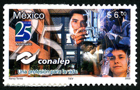 No. Scott: 2344 -- Año de Emisión: 2003 -- Valor Facial: $ 6.00 -- Multicolor -- Perforación: 13 1/2 -- Tipo de Impresión: Offset Tim bre Postal Mexicano multicolor, al fondo de la imagen y del lado izquierdo se observa parte de la fachada de un edificio, del lado derecho aparecen unos jóvenes realizando actividades dentro de un laboratorio, en primer plano está escrito "MÉXICO", el vaor facial de "$6.00", "25 ANIVERSARIO", el emblema del CONALEP "Una profesión para la vida" y "Nancy Torres, TIEV, 2003". Para más información favor de dirigirse a biblioteca@mufi.org.mx