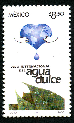 Timbre Postal Mexicano multicolor, en la parte superior de la imagen aparece un corazón y dentro de él, hay un mapamundi, alrededor hay dos manos que lo abrazan y una gota de agua, en la parte inferior aparecen cuatro hojas de plantas color verde, salpicadas con gotas de agua, sobre la estampilla está escrito "MÉXICO", el valor facial de "$8.50", "AÑO INTERNACIONAL EL agua dulce" y TOGNO, TIEV, 2003". No. Scott: 2343 -- Año de Emisión: 2003 -- Valor Facial: $ 8.50 -- Multicolor -- Perforación: 13 -- Tipo de Impresión: Offset Para más información favor de dirigirse a biblioteca@mufi.org.mx