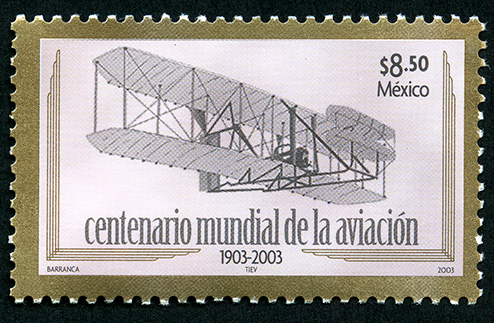 No. Scott: 2306 -- Año de Emisión: 2003 -- Valor Facial: $ 8.50 -- Multicolor -- Perforación: 13 -- Tipo de Impresión: Offset Timbre Postal Mexicano multicolor en la imagen se observa el avión elaborado por los hermanos Wright, mismo que fue una especie de túnel aerodinámico, construído con material muy pesado, motor de solo 12 caballos de fuerza, en la parte superior está escrito el valor facial de "$8.50", "MÉXICO", en la parte inferior "centenario mundial de la aviación 1903-2003" y "BARRANCA, TIEV, 2003". Para más información favor de dirigirse a biblioteca@mufi.org.mx