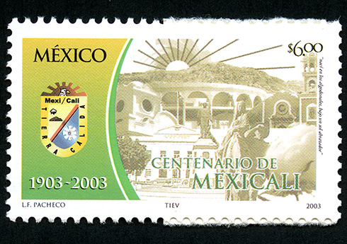 No. Scott: 2309 -- Año de Emisión: 2003 -- Valor Facial: $ 6.00 -- Multicolor -- Perforación: 14 -- Tipo de Impresión: Offset Timbre Pöstal Mexicano multicolor, del lado izquierdo de la imagen aparece el Escudo de la Ciudad de Mexicali, del lado derecho se observan algunos monumentos y edificios históricos de la ciudad, sobre la estampilla está escrito "MÉXICO 1903-2003", el valor facial de "$6.00", "CENTENARIO DE MEXICALI" y L. F. PACHECO, TIEV, 2003". Para más información favor de dirigirse a biblioteca@mufi.org.mx