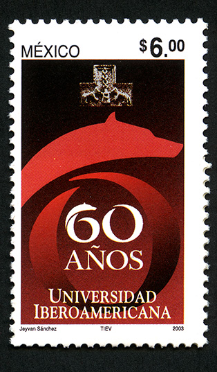 No. Scott: 2307 -- Año de Emisión: 2003 -- Valor Facial: $ 6.00 -- Multicolor -- Perforación: 14 -- Tipo de Impresión: Offset Timbre Postal Mexicano multicolor, en la imagen se observa el logotipo de la Compañía de Jesús, de la Universidad Iberoamericana, representada por dos lobos rampantes a ambos lados de un caldero suspendidode unos llares, sobre la estampilla está escrito "MÉXICO", el valor facial de "$6.00", "60 AÑOS UNIVERSIDAD IBEROAMERICANA" y "Jeyvan Sánchez , TIEV, 2003". Para más información favor de dirigirse a biblioteca@mufi.org.mx