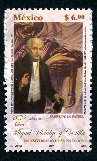 No. Scott: 2312 -- Año de Emisión: 2003 -- Valor Facial: $ 6.00 -- Multicolor -- Perforación: 14 -- Tipo de Impresión: Offset Timbre Postal Mexicano multicolor, al fondo se observa un mural realizado por el pintor José Chavez Morado, titulado Ventana Hidalgo Alhóndiga de Granaditas y en la parte frontal aparece el retrato del Cura Miguel Hidalgo y Costilla, sobre la estampilla está escrito "MÉXICO", el valor facial de "$6.00", "AÑO DE Don Miguel Hidalgo y Costilla", "250 ANIVERSARIO DE SU NATALICIO" y "N. TORRES, TIEV, 2003". Para más información favor de dirigirse a biblioteca@mufi.org.mx