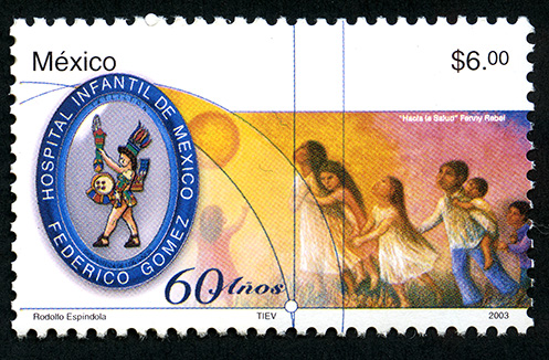 No. Scott: 2311 -- Año de Emisión: 2003 -- Valor Facial: $ 6.00 -- Multicolor -- Perforación: 14 -- Tipo de Impresión: Offset Timbre Postal Mexicano multicolor, al fondo de la imagen se observa una obra de la artísta mexicana Fanny Rabel, titulada "Hacia la Salud", al frente y del lado izquierdo aparece el logotipo del Hospital Infantil de México Federico Gómez, que representa a Ixtlilton, Dios Mexica encargado de la protección de los niños, sobre la estampilla está escrito "MÉXICO", el valor facial de "$6.00", "60 Años" y Rodolfo Espíndola, TIEV, 2003". Para más información favor de dirigirse a biblioteca@mufi.org.mx