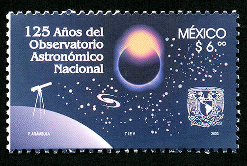 No. Scott: 2314 -- Año de Emisión: 2003 -- Valor Facial: $ 6.00 -- Multicolor -- Perforación: 14 -- Tipo de Impresión: Offset Timbre Postal Mexicano multicolor, la imagen proyecta un eclipse solar ó lunar, visto desde un telescopio, en el cual se aprecia un cielo nublado, casi oscuro rodeado de estrellas, sobre la estampilla está escrito "125 Años del Observatorio Astronómico Nacional", "MÉXICO", el valor facial de "$6.00" y "P. ARÁMBULA, TIEV, 2003". Para más información favor de dirigirse a biblioteca@mufi.org.mx