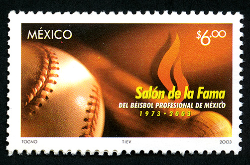 No. Scott: 2318 -- Año de Emisión: 2003 -- Valor Facial: $ 6.00 -- Multicolor -- Perforación: 14 -- Tipo de Impresión: Offset Timbre Postal Mexicano multicolor, en la imagen se observa una pelota de beisbol y parte de un bate de madera, sobre la estampilla está escrito "MÉXICO", el valor facial de "$6.00", "Salón de la Fama DEL BEISBOL PROFESIONAL DE MÉXICO (1793-2003)" y "TOGNO, TIEV, 2003". Para más información favor de dirigirse a biblioteca@mufi.org.mx