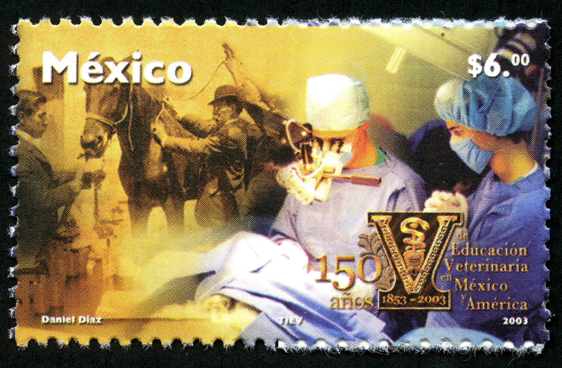 No. Scott: 2320 -- Año de Emisión: 2003 -- Valor Facial: $ 6.00 -- Multicolor -- Perforación: 13 1/2 -- Tipo de Impresión: Offset Timbre Postal Mexicano multicolor, en primer plano podemos ver a dos personas, hombre y mujer, vestidos de médicos, supongo que están realizando una cirugía y que posiblemente estén dentro de un quirófano, en la parte de atrás aparece un caballo con dos personas al lado. Sobre la estampilla está escrito "MÉXICO", el valor facial de "$6.00", "150 Años de Educación Veterinaria en México y América" y "DANIEL DÍAZ, TIEV, 2003.". Para más información favor de dirigirse a biblioteca@mufi.org.mx
