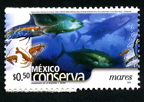 No. Scott: 2321 -- Año de Emisión: 2004 -- Valor Facial: $ 0.50 -- Multicolor -- Perforación: 13 x 13 1/4 -- Tipo de Impresión: Offset Timbre Postal multicolor perteneciente a la colección de México Conserva, en la imagen se observa una porción de agua con un gran número de animales acuáticos que viven en ella como la ballena, tiburón caballito de mar, calamar, cangrejo etc, sobre la estampilla está escrito el valor facial de "0.50", "MÉXICO mares" y "FERNÁNDEZ DE LA REGUERA / MITRE / TIEV". Para más información favor de dirigirse a biblioteca@mufi.org.mx