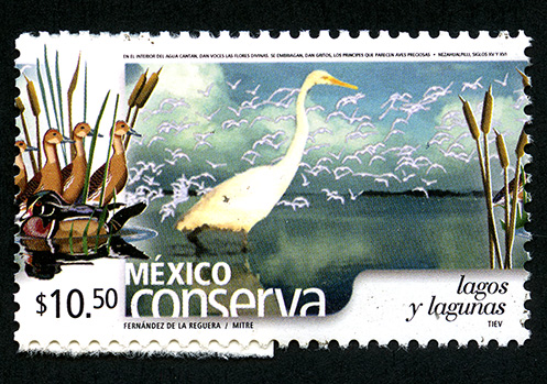 No. Scott: 2329 -- Año de Emisión: 2004 -- Valor Facial: $ 10.50 -- Multicolor -- Perforación: 13 x 13 1/2 -- Tipo de Impresión: Offset Timbre Postal multicolor perteneciente a la colección de México Conserva, al fondo de la imagen aparece una laguna de agua, sobre el cielo un gran número de aves volando, en primer plano y sobre una superficie plana se observa un ave de cuerpo color blanco, patas cortas y pico amarillo, también hay un poco de flora acuática, sobre la estampilla está escrito el valor facial de "10.50", "MÉXICO lagos y lagunas" y "FERNÁNDEZ DE LA REGUERA / MITRE / TIEV". Para más información favor de dirigirse a biblioteca@mufi.org.mx