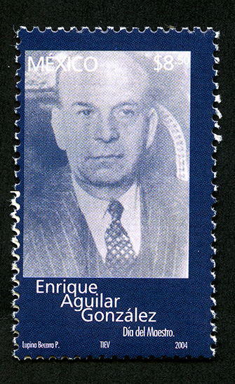 No. Scott: 2347 -- Año de Emisión: 2004 -- Valor Facial: $ 8.50 -- Multicolor -- Perforación: 13 1/2 -- Tipo de Impresión: Offset Timbre Postal Mexicano multicolor, en un fondo color azul y dentro de un marco, se observa el retrato del maestro Enrique Aguilar González, quien fue Director General del Instituto Federal de Capacitación del Magisterio, en la parte superior está escrito "MÉXICO", el valor facial de "$8.50", en ala parte inferior "Enrique Aguilar González", "Día del Maestro" y "Lupina Becerra P., TIEV, 2004". Para más información favor de dirigirse a biblioteca@mufi.org.mx