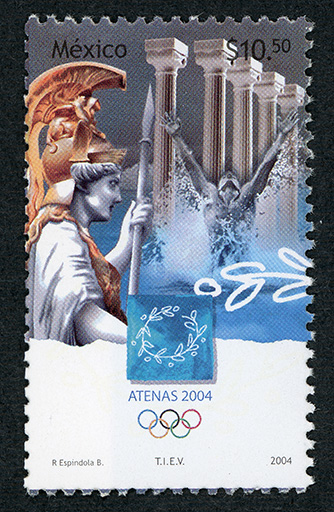 No. Scott: 2355 -- Año de Emisión: 2004 -- Valor Facial: $ 10.50 -- Multicolor -- Perforación:13 -- Tipo de Impresión: Offset Timbre Postal Mexicano multicolor, alusivo a los Juegos Olímpicos de Atenas 2004, al fondo de la imagen se observan algunos monumentos con la arquitectura del país de Grecia, en medio aparece un hombre con el torso desnudo, brazos levantados hacía arriba y saliendo del agua, en primer plano se aprecia el monumento de un personaje histórico griego, sobre la estampilla está escrito "MÉXICO", el valor facial de "$10.50", "ATENAS 2004" y "R. Espíndola B., T.I.E.V., 2004". Para más información favor de dirigirse a biblioteca@mufi.org.mx