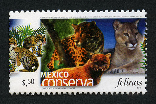 No. Scott: 2362 -- Año de Emisión: 2004 -- Valor Facial: $ 0.50 -- Multicolor -- Perforación: 13 x 13 1/2 -- Tipo de Impresión: Offset Timbre Postal multicolor perteneciente a la colección de México Conserva, sobre un fondo azul y verde, aparece una familia de mamíferos carnívoros, de cuerpo esbelto, hocico corto y cabeza redondeada, sobre la estampilla está escrito el valor facial de "$.50", "MÉXICO felinos" y "FERNÁNDEZ DE LA REGUERA / MITRE / TIEV". Para más información favor de dirigirse a biblioteca@mufi.org.mx