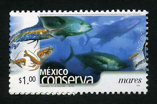 No. Scott: 2363 -- Año de Emisión: 2004 -- Valor Facial: $ 1.00 -- Multicolor -- Perforación: 13 x 13 1/4 -- Tipo de Impresión: Offset Timbre Postal multicolor perteneciente a la colección de México Conserva, en la imagen se observa una porción de agua con un gran número de animales acuáticos que viven en ella como la ballena, tiburón caballito de mar, calamar, cangrejo etc, sobre la estampilla está escrito el valor facial de "1.00", "MÉXICO mares" y "FERNÁNDEZ DE LA REGUERA / MITRE / TIEV". Para más información favor de dirigirse a biblioteca@mufi.org.mx