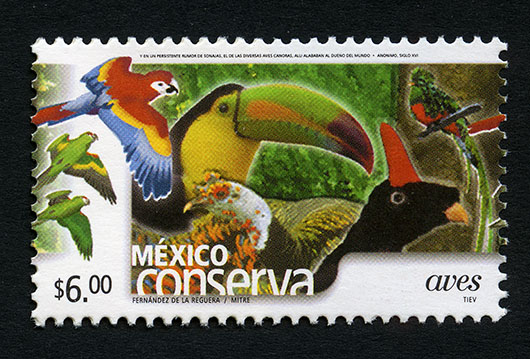 No. Scott: 2369 -- Año de Emisión: 2004 -- Valor Facial: $ 6.00 -- Multicolor -- Perforación: 13 x 13 1/4 -- Tipo de Impresión: Offset Timbre Postal multicolor perteneciente a la colección de México Conserva, en la imagen aparece una gran diversidad de aves de diferentes colores, formas y tamaños, sobre la estampilla está escrito el valor facial de "$6.00", "MÉXICO aves" y "FERNÁNDEZ DE LA REGUERA / MITRE / TIEV". Para más información favor de dirigirse a biblioteca@mufi.org.mx