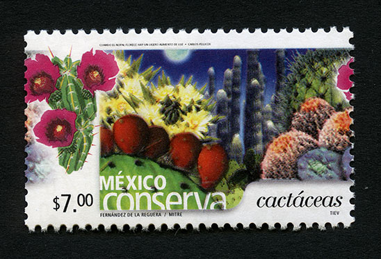 No. Scott: 2372 -- Año de Emisión: 2004 -- Valor Facial: $ 7.00 -- Multicolor -- Perforación: 13 x 13 1/4 -- Tipo de Impresión: Offset Timbre Postal multicolor perteneciente a la colección de México Conserva, en la imagen aparece un paisaje cactáceo, en él hay cactus de talle largo y muy espinosos, en la parte frontal se aprecian estos mismos pero en tamaño reducido, con flores y frutos, sobre la estampilla está escrito el valor facial de "$7.00", "MÉXICO cactáceas" y "FERNÁNDEZ DE LA REGUERA / MITRE / TIEV". Para más información favor de dirigirse a biblioteca@mufi.org.mx