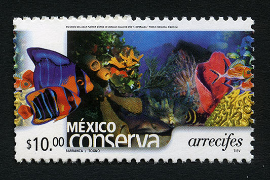 No. Scott: 2374 -- Año de Emisión: 2004 -- Valor Facial: $ 10.00 -- Multicolor -- Perforación: 13 x 13 1/4 -- Tipo de Impresión: Offset Timbre Postal multicolor perteneciente a la colección de México Conserva, en la imagen aparece un paisaje marino, con gran diversidad de especies y algas, en la cual aparecen algunos invertebrados y peces, sobre la estampilla está escrito el valor facial de "$10.00", "MÉXICO arrecifes" y "FERNÁNDEZ DE LA REGUERA / MITRE / TIEV". Para más información favor de dirigirse a biblioteca@mufi.org.mx
