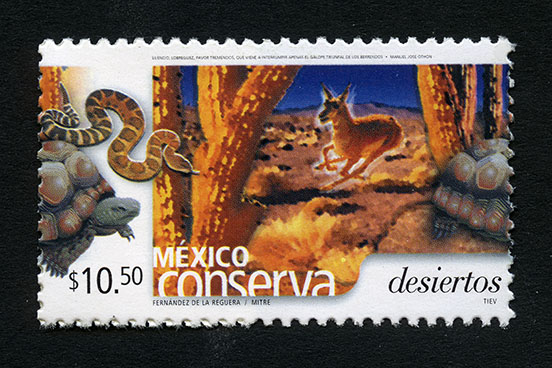 No. Scott: 2375 -- Año de Emisión: 2004 -- Valor Facial: $ 10.50 -- Multicolor -- Perforación: 13 x 13 1/4 -- Tipo de Impresión: Offset Timbre Postal multicolor perteneciente a la colección de México Conserva, en la imagen aparece un paisaje con terreno arenoso y carente de vegetación, solo se observan algunos cactus y algunos animales como la tortuga, serpiente y zorro, sobre la estampilla está escrito el valor facial de "$10.50", "MÉXICO desiertos" y "FERNÁNDEZ DE LA REGUERA / MITRE / TIEV". Para más información favor de dirigirse a biblioteca@mufi.org.mx