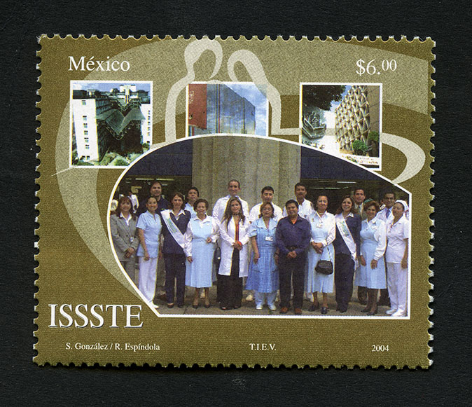 No. Scott: 2378 -- Año de Emisión: 2004 -- Valor Facial: $ 6.00 -- Multicolor -- Perforación:13 1/4 x 13 -- Tipo de Impresión: OffsetTimbre Postal Mexicano multicolor, al fondo de la imagen y dentro de cuadros, se observan tres imágenes del edificio del Instituto de Seguridad y Servicios sociales de los Trabajadores al Servicio del Estado, al frente se aprecia un gran número de personas hombres y mujeres, vestidos de diferente manera, algunos portan batas blancas y uniformes de enfermeras y otros están vestidos con ropa de civil, sobre la estampilla está escrito "MÉXICO", el valor facial de "$6.00", "ISSSTE" y "S. González / R. Espíndola, TIEV, 2004".
