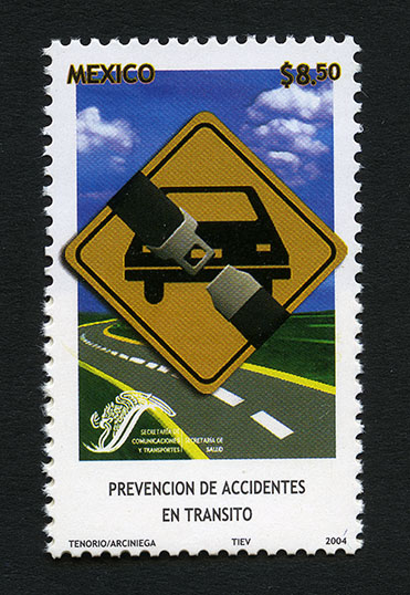 No. Scott: 2393 -- Año de Emisión: 2004 -- Valor Facial: $ 8.50 -- Multicolor -- Perforación: 13 -- Tipo de Impresión: Offset Timbre Postal Mexicano multicolor, al fondo se observa un cielo azul cubierto con nubes y una carretera con áreas verdes, al frente y dentro de una figura geométrica, aparece un señalamiento de tránsito que significa usar el cinturón de seguridad. Sobre la estampilla está escrito "MÉXICO", el valor facial de "$8.50", el emblema de la "SECRETARÍA DE COMUNICACIONES Y TRANSPORTES", "PREVENCIÓN DE ACCIDENTES DE TRANSITO" y "TENORIO ARCINIEGA, TIEV, 2004". Para más información favor de dirigirse a biblioteca@mufi.org.mx