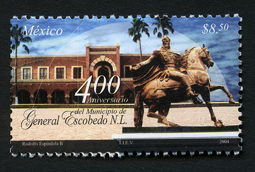 No. Scott: 2389 -- Año de Emisión: 2004 -- Valor Facial: $ 8.50 -- Multicolor -- Perforación: 13 -- Tipo de Impresión: Offset Timbre Postal Mexicano multicolor, al fondo de la imagen y con un cielo azul, se observa la fachada del Palacio de Gobierno de la Ciudad General Escobedo, al frente aparece el monumento histórico del personaje Mariano Escobedo montando un caballo, sobre la estampilla está escrito "MÉXICO", el valor facial de "$8.50", "400 Aniversario del Municipio de General Escobedo N.L." y "Rodolfo Espíndola, TIEV, 2004". Para más información favor de dirigirse a biblioteca@mufi.org.mx