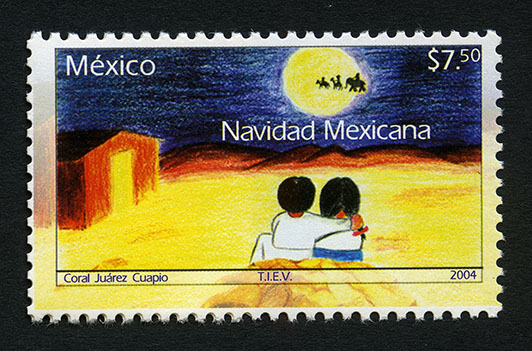 No. Scott: 2391 -- Año de Emisión: 2005 -- Valor Facial: $ 7.50 -- Multicolor -- Perforación: 13 x 13 1/4, 13 1/4 x 13-- Tipo de Impresión: Offset Timbre Postal Mexicano multicolor, en la imagen aparece una ilustración infantil, al fondo se observa un cielo azul muy oscuro, casi negro, una esfera en color amarillo y en ella aparecen tres siluetas de animales y sobre de ellos figuras humanas, en medio algunas montañas rocosas, en primer plano se aprecia una casita y dos niños abrazados y sentados de espaldas. Sobre la estampilla está escrito "MÉXICO", el valor facial de "$7.50", "Navidad Mexicana" y "Coral Juárez Cuapio, TIEV, 2004". Para más información favor de dirigirse a biblioteca@mufi.org.mx