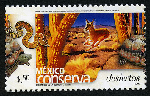 No. Scott: 2394 -- Año de Emisión: 2005 -- Valor Facial: $ .50 -- Multicolor -- Perforación: 13 1/4 -- Tipo de Impresión: Offset Timbre Postal multicolor perteneciente a la colección de México Conserva, en la imagen aparece un paisaje con terreno arenoso y carente de vegetación, solo se observan algunos cactus y algunos animales como la tortuga, serpiente y zorro, sobre la estampilla está escrito el valor facial de "$.50", "MÉXICO desiertos" y "FERNÁNDEZ DE LA REGUERA / MITRE / TIEV". Para más información favor de dirigirse a biblioteca@mufi.org.mx