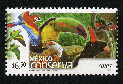 No. Scott: 2397 -- Año de Emisión: 2005 -- Valor Facial: $ 6.50 -- Multicolor -- Perforación: 13 x 13 1/4 -- Tipo de Impresión: Offset Timbre Postal multicolor perteneciente a la colección de México Conserva, en la imagen aparece una gran diversidad de aves de diferentes colores, formas y tamaños, sobre la estampilla está escrito el valor facial de "$ 6.50", "MÉXICO aves" y "FERNÁNDEZ DE LA REGUERA / MITRE / TIEV". Para más información favor de dirigirse a biblioteca@mufi.org.mx
