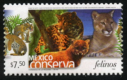 No. Scott: 2400 -- Año de Emisión: 2005 -- Valor Facial: $ 7.50 -- Multicolor -- Perforación: 13 x 13 1/4 -- Tipo de Impresión: Offset Timbre Postal multicolor perteneciente a la colección de México Conserva, sobre un fondo azul y verde, aparece una familia de mamíferos carnívoros, de cuerpo esbelto, hocico corto y cabeza redondeada, sobre la estampilla está escrito el valor facial de "$ 7.50", "MÉXICO felinos" y "FERNÁNDEZ DE LA REGUERA / MITRE / TIEV". Para más información favor de dirigirse a biblioteca@mufi.org.mx