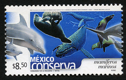 No. Scott: 2401 -- Año de Emisión: 2005 -- Valor Facial: $ 8.50 -- Multicolor -- Perforación: 13 x 13 1/4 -- Tipo de Impresión: Offset Timbre Postal multicolor perteneciente a la colección de México Conserva, en la imagen se observa un paisaje acuático en el cual aparece un gran número de mamíferos marinos, los cuales poseen poco pelo, por lo general muy pocas cerdas retenidas alrededor de la cabeza o boca, sobre la estampilla está escrito el valor facial de "$ 8.50", "MÉXICO mamíferos marinos" y "FERNÁNDEZ DE LA REGUERA / MITRE / TIEV". Para más información favor de dirigirse a biblioteca@mufi.org.mx