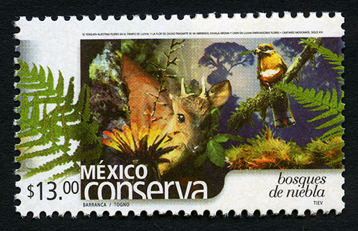 No. Scott: 2403 -- Año de Emisión: 2005 -- Valor Facial: $ 13.50 -- Multicolor -- Perforación: 13 x 13 1/4 -- Tipo de Impresión: Offset Timbre Postal multicolor perteneciente a la colección de México Conserva, en la imagen aparece un bosque nublado, con selva húmeda y montañoso, tambión aparecen se observa a un ave y a un animal mamífero, sobre la estampilla está escrito el valor facial de "$ 13.50", "MÉXICO bosques de niebla" y "FERNÁNDEZ DE LA REGUERA / MITRE / TIEV". Para más información favor de dirigirse a biblioteca@mufi.org.mx
