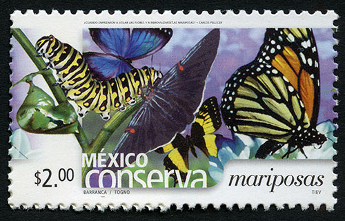 No. Scott: 2409 -- Año de Emisión: 2005 -- Valor Facial: $ 2.00 -- Multicolor -- Perforación: 13 x 13 1/4 -- Tipo de Impresión: Offset Timbre Postal multicolor perteneciente a la colección de México Conserva, en la imagen aparecen algunos insectos de gran belleza y diferentes colores, tienen antenas, ojos, patas y alas, al frente y sobre una rama en color verde se observa una oruga o larva, sobre la estampilla está escrito el valor facial de "$ 2.00", "MÉXICO mariposas" y "FERNÁNDEZ DE LA REGUERA / MITRE / TIEV". Para más información favor de dirigirse a biblioteca@mufi.org.mx