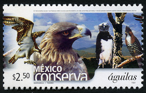 No. Scott: 2412 -- Año de Emisión: 2005 -- Valor Facial: $ 2.50 -- Multicolor -- Perforación: 13 x 13 1/4 -- Tipo de Impresión: Offset Timbre Postal multicolor perteneciente a la colección de México Conserva, en la imagen aparecen algunas aves de gran tamaño, constitución robusta, cabeza y pico grande, poderoso y puntiagudo para poder desprender la carne de su presa, también tienen garras y grandes alas, sobre la estampilla está escrito el valor facial de "$ 2 .50", "MÉXICO águilas" y "FERNÁNDEZ DE LA REGUERA / MITRE / TIEV". Para más información favor de dirigirse a biblioteca@mufi.org.mx
