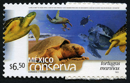 No. Scott: 2419 -- Año de Emisión: 2005 -- Valor Facial: $ 6.50 -- Multicolor -- Perforación: 13 x 13 1/4 -- Tipo de Impresión: Offset Timbre Postal multicolor perteneciente a la colección de México Conserva, en la imagen aparece un paisaje acuático en el cual se aprecia un gran número de tortugas marinas, sobre la estampilla está escrito el valor facial de "$ 6.50", "MÉXICO tortugas marinas" y "FERNÁNDEZ DE LA REGUERA / MITRE / TIEV". Para más información favor de dirigirse a biblioteca@mufi.org.mx