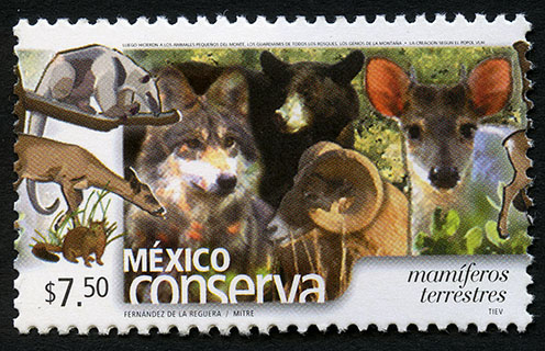 No. Scott: 2426 -- Año de Emisión: 2005 -- Valor Facial: $ 7.50 -- Multicolor -- Perforación: 13 x 13 1/4 -- Tipo de Impresión: Offset Timbre Postal multicolor perteneciente a la colección de México Conserva, en ella aparece un gran número de animales mamíferos como el oso, lobo, perro, ardilla, borrego cimarrón y lobo, sobre la estampilla está escrito el valor facial de "$7.50", "MÉXICO mamíferos terrestres" y "FERNÁNDEZ DE LA REGUERA / MITRE / TIEV". Para más información favor de dirigirse a biblioteca@mufi.org.mx
